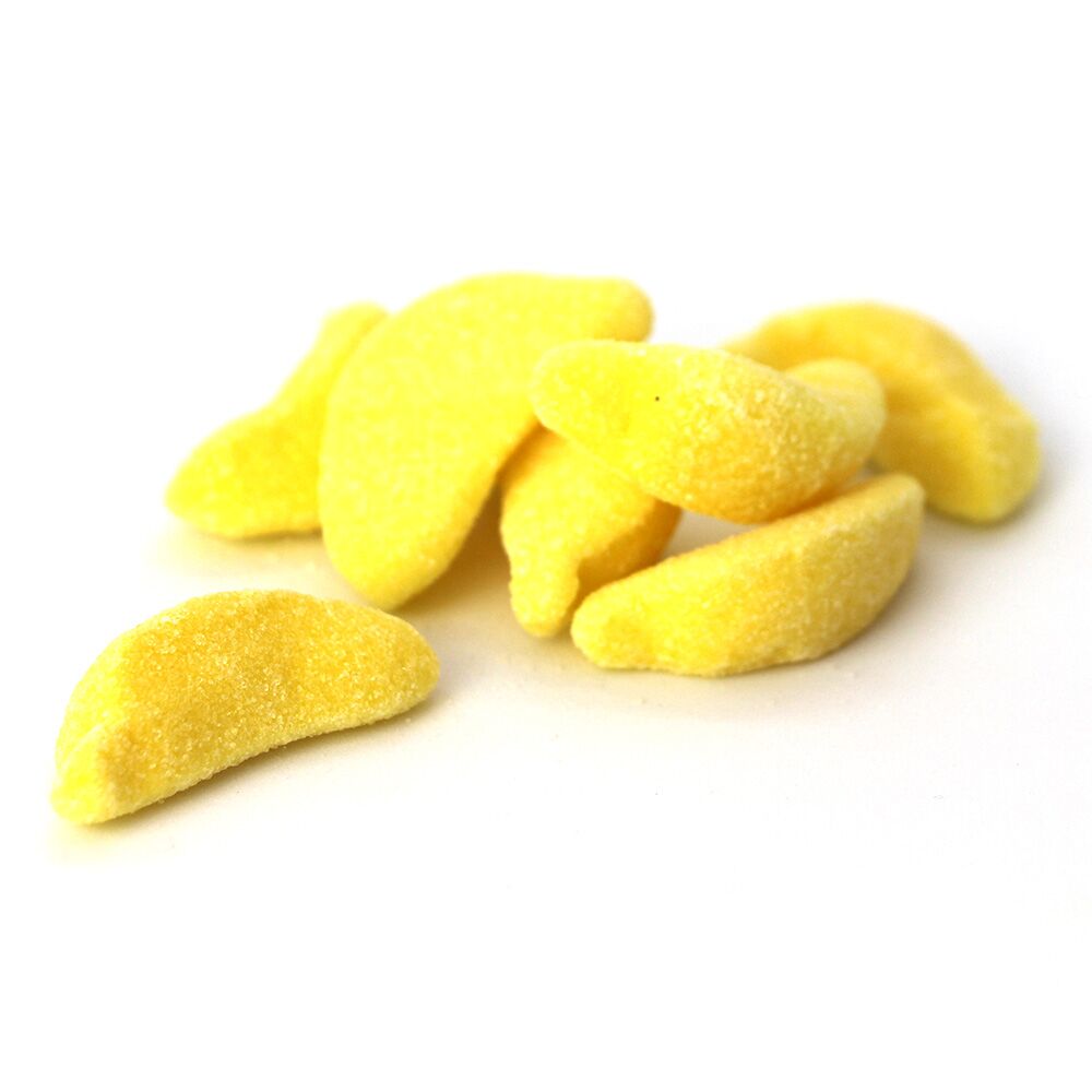 Sucre, sirop de glucose, dextrose, humectant : sirop de sorbitol, eau, gélatine, acidifiant : acide citrique, arôme, colorant : curcumine.