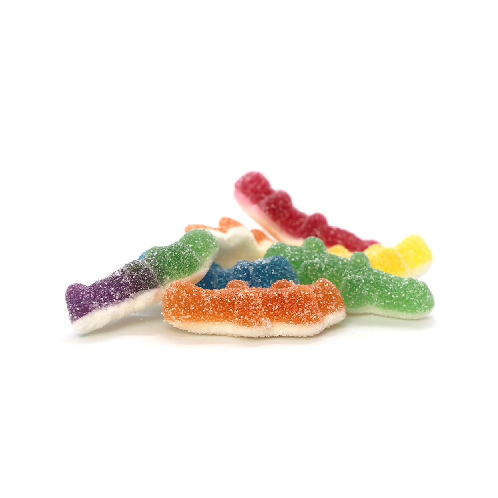 Sirop de glucose; sucre; gélatine; dextrose; acidifiants: acide citrique, acide malique; agent d’enrobage: cire de carnauba; correcteurs d’acidité: citrate tricalcique, malate acide de sodium; arôme; concentrés de fruits et de plantes: carthame, spiruline, pomme, patate douce, radis; sirop de sucre inverti; colorants: carotènes végétaux, lutéine, anthocyanes.
